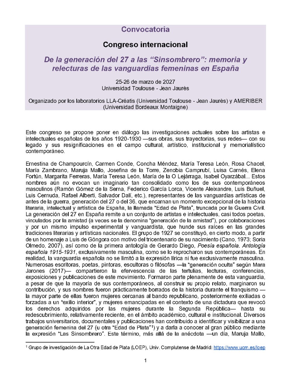 Colloque De la generación del 27 a las Sinsombrero: memoria y relecturas de las vuanguardias femeninas en España