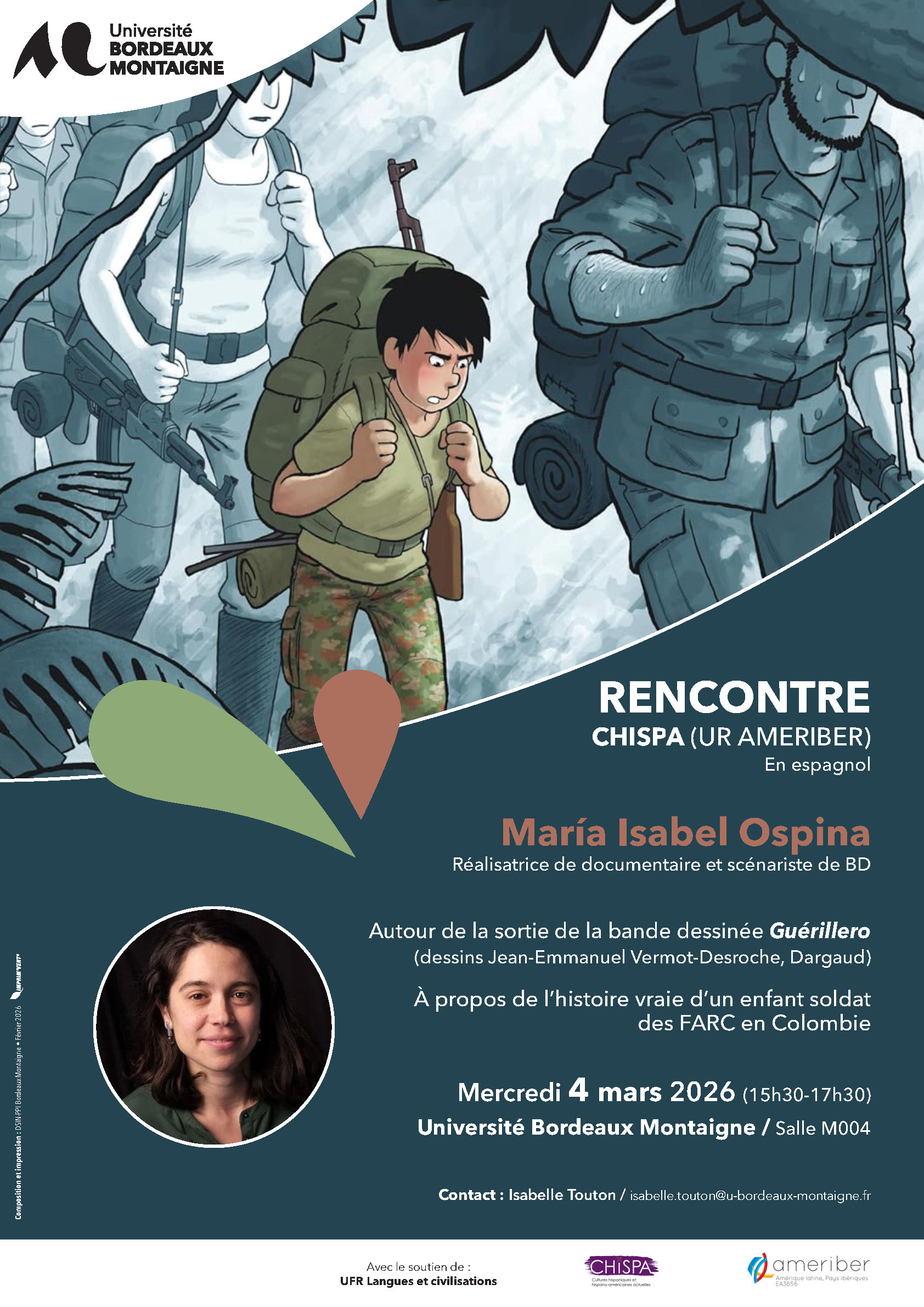 Rencontre avec María Isabel Ospina, réalisatrice de documentaire et scénariste de BD, autour de la sortie de la bande dessinée Guérillero (dessins de Jean-Emmanuel Vernot-Desroche, Dargaud), à propos de l'histoire vraie d'un enfant-soldat des FARC en Colombie.